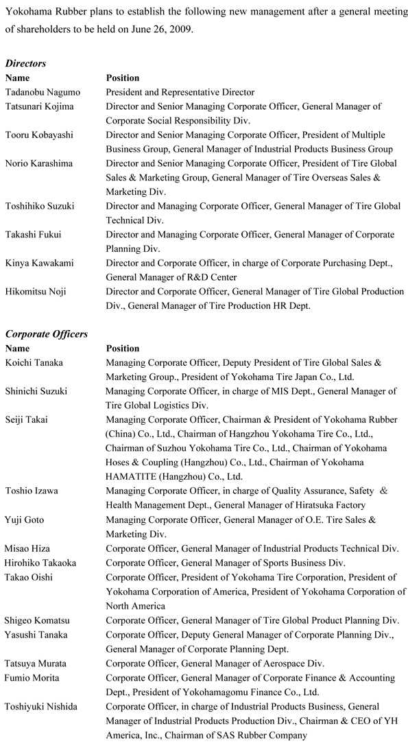 | |  | Senior Management Changes | |  | At a meeting held on May 12, 2009, the Board of Directors of Yokohama Rubber Co., Ltd., adopted the following senior management changes that will formally be approved after a general meeting of shareholders to be held on June 26, 2009.
