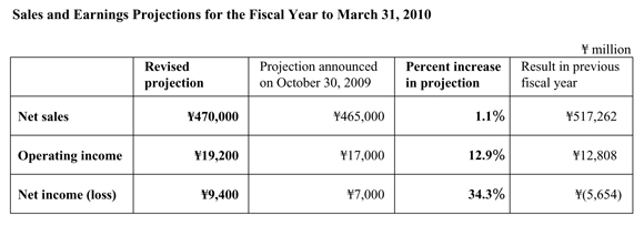 | PDF (93 KB)  |  |  |  |  |  |  |  | Yokohama Rubber Raises Sales and Earnings Projections |  |  |  |  |  | Tokyo-Yokohama Rubber Co., Ltd., announced today that it has raised its projections for consolidated net sales and earnings in the fiscal year to March 31, 2010. The company now projects net income of 9.4 billion yen, compared with a net loss of 5.7 billion yen in the previous fiscal year. It projects that operating income will rise 49.9%, to 19.2 billion yen, and that net sales will decline 9.1%, to 470.0 billion yen. The projection for net income is 34.3% higher than the projection announced on October 30, 2009; the projection for operating income is 12.9% higher; and the projection for net sales is 1.1% higher.
